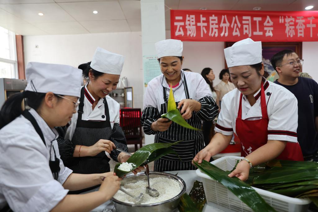 卡房分公司開展“粽香千里 情系卡房”端午節(jié)比賽活動。隨著計時口令的發(fā)出,大家雙手靈巧地舞動著,將糯米、粽葉巧妙地組合成一個個精致的粽子,在一場充滿激情的無聲較量中增進交流互動。